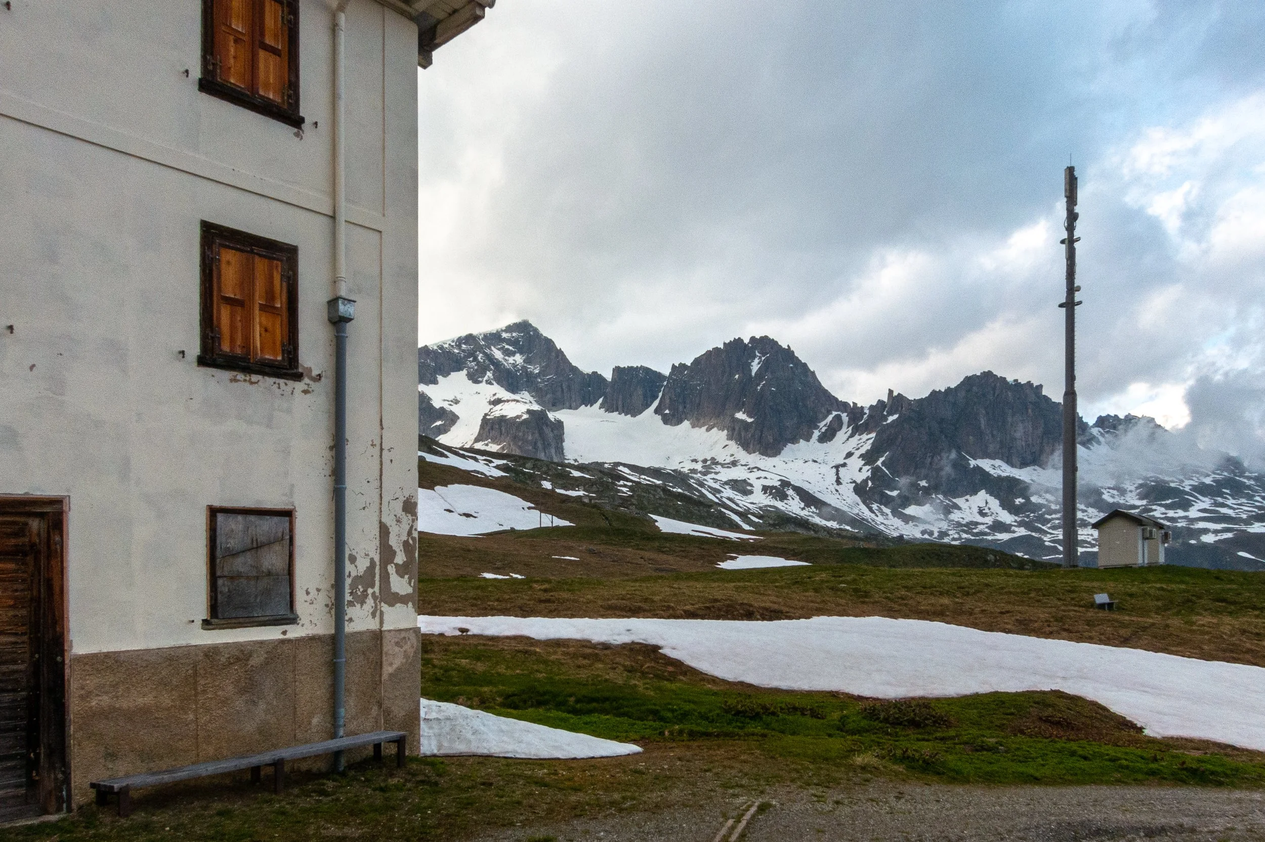 Der Strasse entlang Richtung Graubünden steht nach den Militärbaracken links das Refuge Furka. Auch hier geschlossene Läden. Antike Stalltüren auf der einen Seite, zwei nur wenig jüngere Autogaragentore auf der anderen. Ein Relikt aus den frühen Jahren des Automobils? Am Türrahmen eine Regaplaquette. Mehr bietet die ehemalige SAC-Hütte nicht für Berggänger mit Notfall. Dahinter ein Bächli – wozu es kanalisiert wurde, weiss heute niemand mehr. Der Schnee reicht noch bis ans Refuge, schwer komprimiert und dreckiggrau. Darunter von Gewölben überspannte Rinnsale. Das Gras ist noch braun und flachgepresst, doch erste Knospen drängen sich schon durch den Schlamm, in ein paar Tagen werden wohl die ersten Enziane und Narzissen blühen.